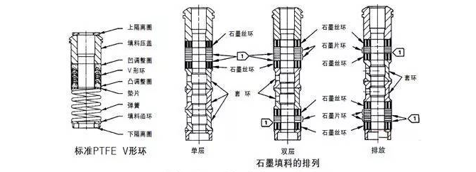 全部的組合:填料、填料壓蓋、填料螺母、套環、填料彈簧、填料法蘭、填料法蘭雙頭螺栓或單頭螺栓、填料法蘭螺母、填料環、填料隔離圈環、毛氈隔離圈、Belleville 彈簧和抗擠壓環。單獨的填料零件示于圖1-13。