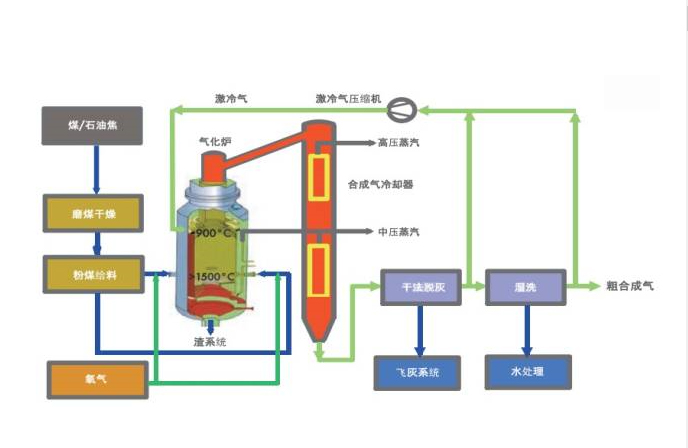 干粉氣化工藝的基本過程:原煤加助燃劑,破碎磨成煤粉,由高壓氮氣流輸送進氣化爐,在壓力4.1 MPa、溫度1500—1600℃的條件下,與配加的氧氣和水蒸汽瞬時完成揮發分脫除、裂解、燃燒及轉化的一系列物理化學過程,氣化產物為粗合成氣,煤灰熔化以液態流出。