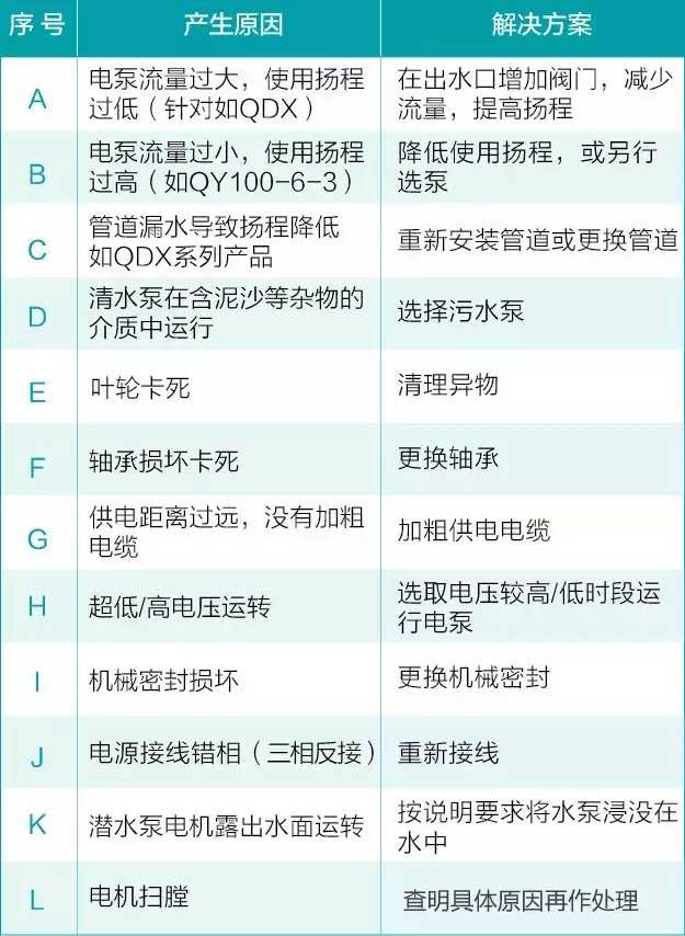 病癥四、水泵不出水 產(chǎn)生原因:泵體和吸水管沒灌滿引水;動水位低于水泵濾水管;吸水管破裂等。 排除方法:排除底閥故障,灌滿引水;降低水泵的安裝位置,使濾水管在動水位之下,或等動水位升過濾水管再抽水;修補或更換吸水管。 病癥五、泵體劇烈振動或產(chǎn)生噪音 產(chǎn)生原因:水泵安裝不牢或水泵安裝過高;電機滾珠軸承損壞;水泵主軸彎曲或與電機主軸不同心、不平行等。 處理方法:裝穩(wěn)水泵或降低水泵的安裝高度;更換電機滾珠軸承;矯正彎曲的水泵主軸或調(diào)整好水泵與電機的相對位置。 病癥六、功率消耗過大 產(chǎn)生原因:水泵轉(zhuǎn)速太高;水泵主軸彎曲或水泵主軸與電機主軸不同心或不平行;選用水泵揚程不合適;水泵吸入泥沙或有堵塞物;電機滾珠軸承損壞等。 處理方法:檢查電路電壓,降低水泵轉(zhuǎn)速;矯正水泵主軸或調(diào)整水泵與電機的相對位置;選用合適揚程的水泵;清理泥沙或堵塞物;更換電機的滾珠軸承。 病癥七、傳動軸或電機軸承過熱 產(chǎn)生原因:缺少潤滑油或軸承破裂等。 處理方法:加注潤滑油或更換軸承。 這些是造成水泵“病癥”的常見原因,并不是所有原因,實踐中處理故障,還因根據(jù)具體問題,實際分析,應(yīng)遵從先外后里的原則,切勿盲目操作。
