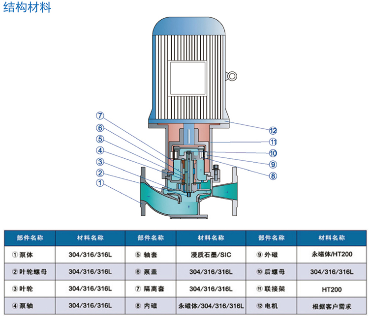 2、材質(zhì)優(yōu)良,泵體、葉輪、隔離套等過(guò)流部件均采用優(yōu)質(zhì)不銹鋼制造;
