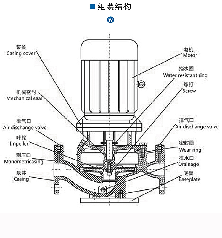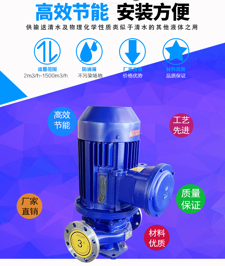 WJLG管道泵為立式結構,進出口口徑相同,且位于同一中心線上,可象閥門一樣安裝在管路之中,外形緊湊美觀,占地面積小,建筑投入低,如加上防護罩則可置于戶外使用。葉輪直接安裝在電機的加長軸上,軸向尺寸短、泵與電機軸承配置合理,能有效地平衡泵運轉產生的徑向和軸向負荷,從而保證了泵的運行平穩,振動噪音很低。安裝檢修方便面,無需拆動管路系統,只要卸下泵聯體座螺母即可抽出全部轉子部件。可根據管路布置的要求采用泵的豎式和橫式安裝。ISG管道泵分基本型、分流型、切割型,材質可選:鑄鐵、201、304、316L,等多種規格。